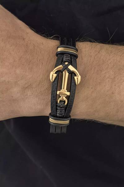 Leather Steel Gold Anchor Bracelet Jerone Jewellery